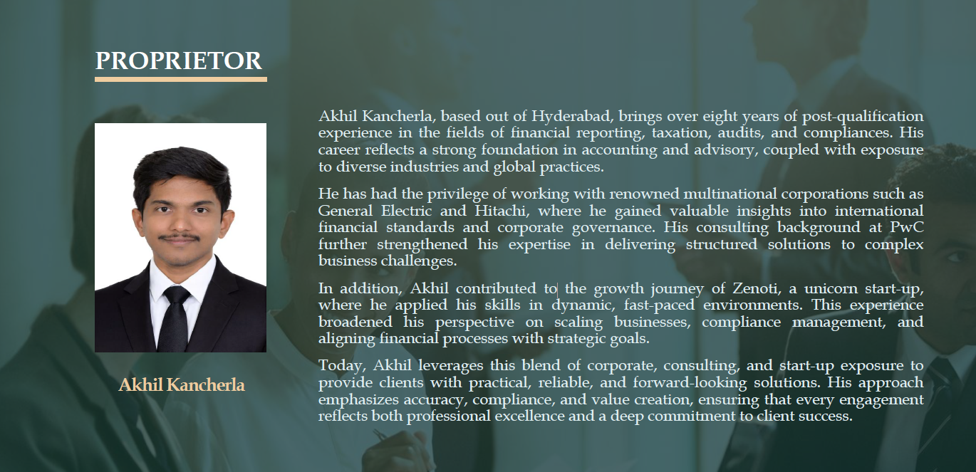 Akhil Kancherla, based out of Hyderabad, brings over eight years of post-qualification experience in the fields of financial reporting, taxation, audits, and compliances. His career reflects a strong